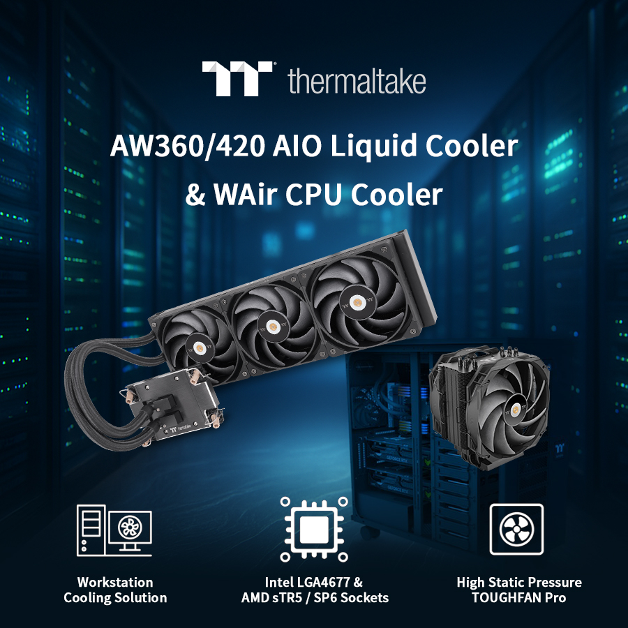 A Thermaltake AW360/420 AIO-folyadékhűtése és a WAir processzorhűtő új mércét állít fel a munkaállomások hűtési megoldásainak terén az ipari minőségű anyagok, a fejlett kialakítás és a munkaállomás-specifikus csatlakozókkal való kompatibilitás ötvözésével. Akár páratlan folyadékhűtési kapacitásra, akár a nagy teljesítményű léghűtés megbízhatóságára van szükséged, a Thermaltake globális kiskereskedői és forgalmazói hálózatán keresztül már elérhető célzott megoldásokat kínál, melyek készen állnak a legigényesebb professzionális alkalmazásokra.